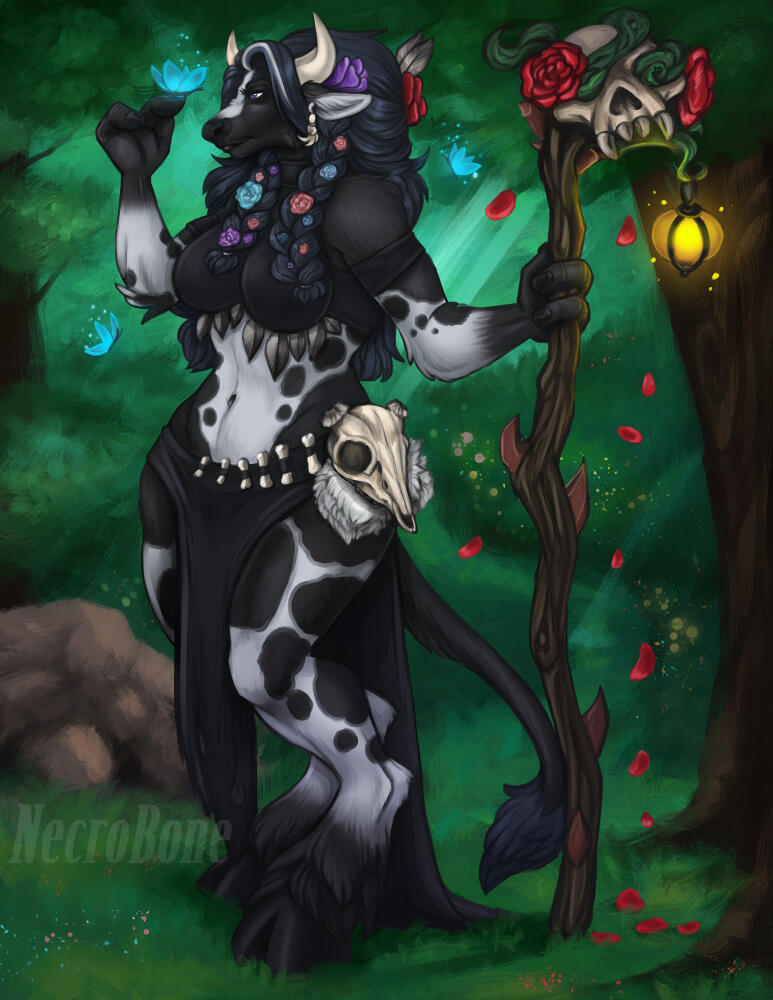Name: Moriamu GhosthornAge: AgelessHeight: 6'8"Sex: FemalePronouns: She/HerSpecies: Green Dragon (Tauren Visage)Orientation: BisexualRole: SwitchOccupation: Druid of the AntlerAppearance: Moriamu, most often just called Mori or Mu, in a first glance is... strange. She's covered head to toe in dark robes, the leather looking as though it was stitched together with gnarled dark wood and webs. Bright blue butterflies flutter around her shoulders, landing on the armor and occasionally on her horns and never straying too far. The crescent moon above her forehead stands out, a stark difference from the rest of her armor.Her eyes are a vibrant violet, framed by dark fur with a white streak down between her eyes and down her nose. The fur around her eyes are particularly dark, making it look as though dark bags are under her eyes. Her half-awake expression doesn't help, the Tauren looking half asleep at any given moment as though she hasn't slept properly in ages. She has black and white spotted fur, much like a Holstein cow, but the more prominent white areas of fur are hidden under her robes. Her hooves are neatly polished and cleaned, as well as decorated with silver filigree that looks like moons and stars.She often smells of forests, with a grassy, almost aged earth type scent that seems to linger around her. Various flowers are tucked in her braids, placed behind her ears, or fashioned into a crown and resting upon her head. Along her hips are pouches, filled to the brim with an assortment of plants and flowers, it quite obvious this cow has a penchant for plants.A small stag skull rests on her hip, along with a few bone pieces that dangle from her belt. Bone fragments, that seem to resemble antlers, dangle from her ears. In hand at all times is a large wooden staff, a skull fixed on the end with gnarled vines and mageroyals that seem to be always blooming. Occasionally, she'll hang a lantern from her staff as she walks.Personality: Mori is almost what you'd expect for a Tauren. Kind, a bleeding heart, patient, and supportive. She's quite strong-willed, given her views of the balance of life and death, revering both as important aspects of the cycle and not quite afraid to state her opinions on such. She is open-minded though, willing to listen and will gladly offer her services to those in need. Being an adamant follower of Malorne, or Apa'ro in her native tongue, she is a fierce protector of those she loves and those who cannot defend themLikes: Children, flowers, the moon, her pets, gardening.Dislikes: Selfish people, dragon hunters.Favorite food: Anything vegetarian.