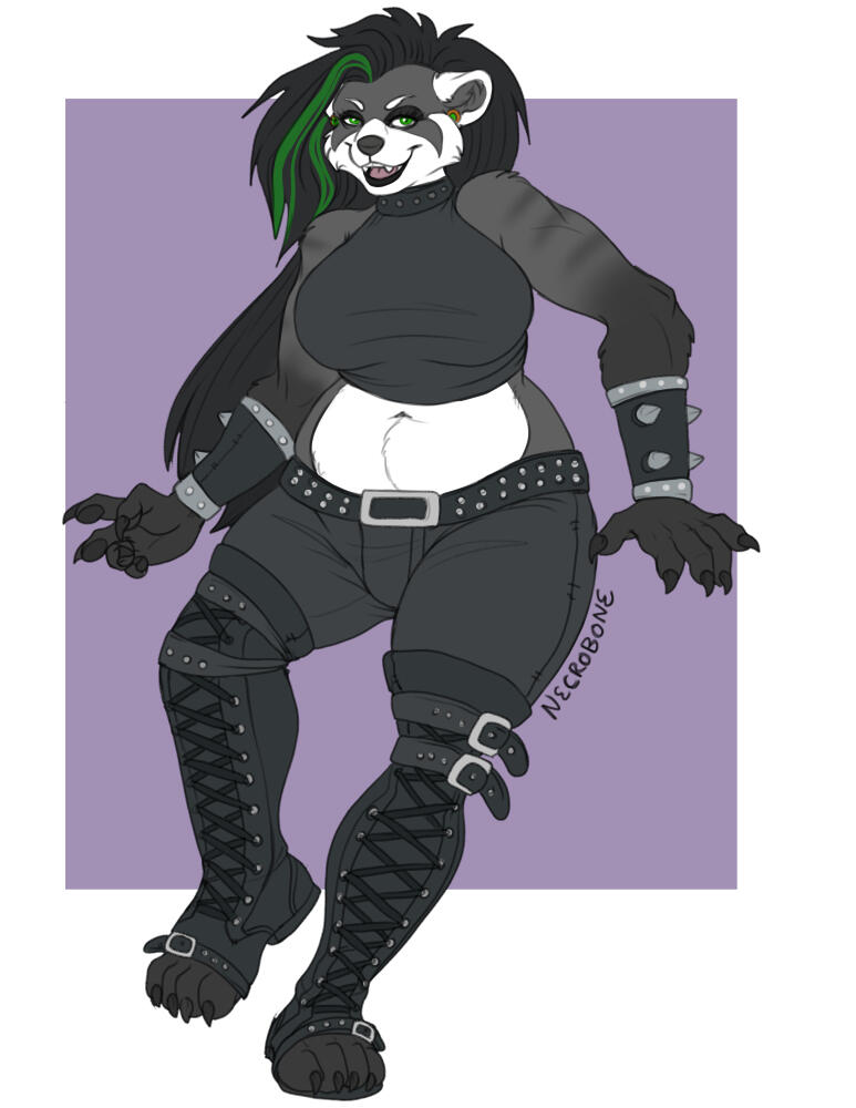(Nesting partner, partner, and long-distance partner)Role: Dominate SwitchOccupation: ArtistCardinal Direction: EastElement: Water/EarthAspect: Life and Death. Mori is a reflection of the self and the exploration that comes with it. Through the use of withcraft and shadow work, Mori is the process of looking at the good and bad traits we all have and share and striving to learn, do better, and forgive.Appearance: Mori is a giant panda with black markings that cover her arms and legs, with a curved arch over her bust and a upwards crescent moon on her chest. Three stripes are on either side of her hip. A black trail follows down her spine and to her tail, which is also black. From the trail there are wayward striping that gives her a slight rib-cage look on the back. Her face is white with a black nose, and black eye mask isolated to around each eye. There are two black dots above her brows. Her bangs are always bright green, with the rest a very dark brown. Her hair is shoulder length, with a slight wave to it. Her eyes are brown. She has a loop piercing in the center of her lower lip, along with two lobe piercings in each ear. Her right ear has an industrial piercing. There are two helix piercings in her upper left ear. Her claws and toe nails are usually painted bright green. She is full figured and chubby, with wide hips and a DD cup chest. She is not perky and perfect, her body shows weight and age.Personality: Playful and silly, but very caring and protective. Has been noted of having a strong presence and quick-witted humor, but is very friendly and pretty chill. Been compared to Toph (ATLA), Haruko (FLCL), Vegeta (DBZ), Jane (Daria), and Sailor Venus (Sailor Moon).Likes: Art, tea, collecting bones (vulture culture), cars, video games, cats, bees, metal music, role-playing, dancing.Dislikes: Olives, baby corn.Favorite food: Crab legs, Mongolian BBQ.