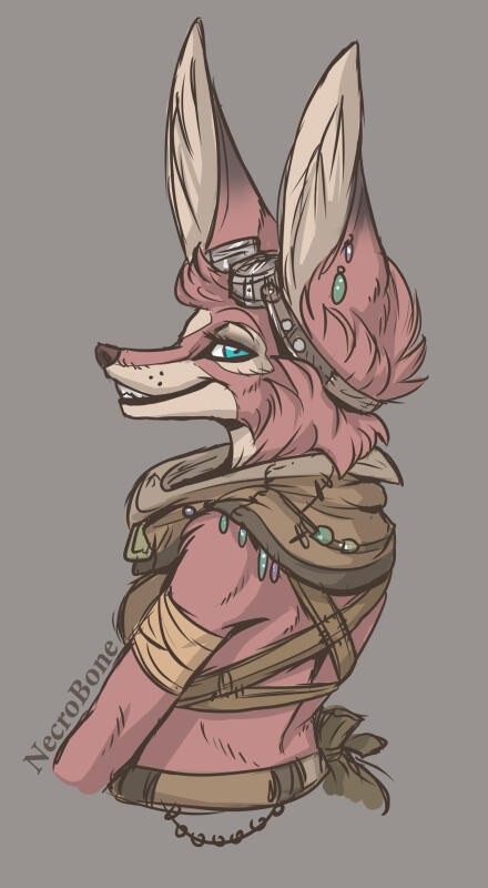 Name: KoriAge: 19Height: 4'3"Sex: FemalePronouns: She/HerSpecies: VulperaOrientation: AsexualRole: NoneOccupation: Scavenger/Machinist.Appearance: Pink and tan fur, large ears and cyan eyes. Wears a pair of goggles on her head and sandy-dune appropriate clothing. Lots of beads and knickknacks on her belt or armor.Personality: Not the brightest crayon in the box. Love to salvage things and build what she can from them. She's generally kind of dumb but she does well with tech. Priorities in life are food.Likes: Food, sweets, candies, baked goods, any food she can get.Dislikes: No food.Favorite food: She'll eat anything.
