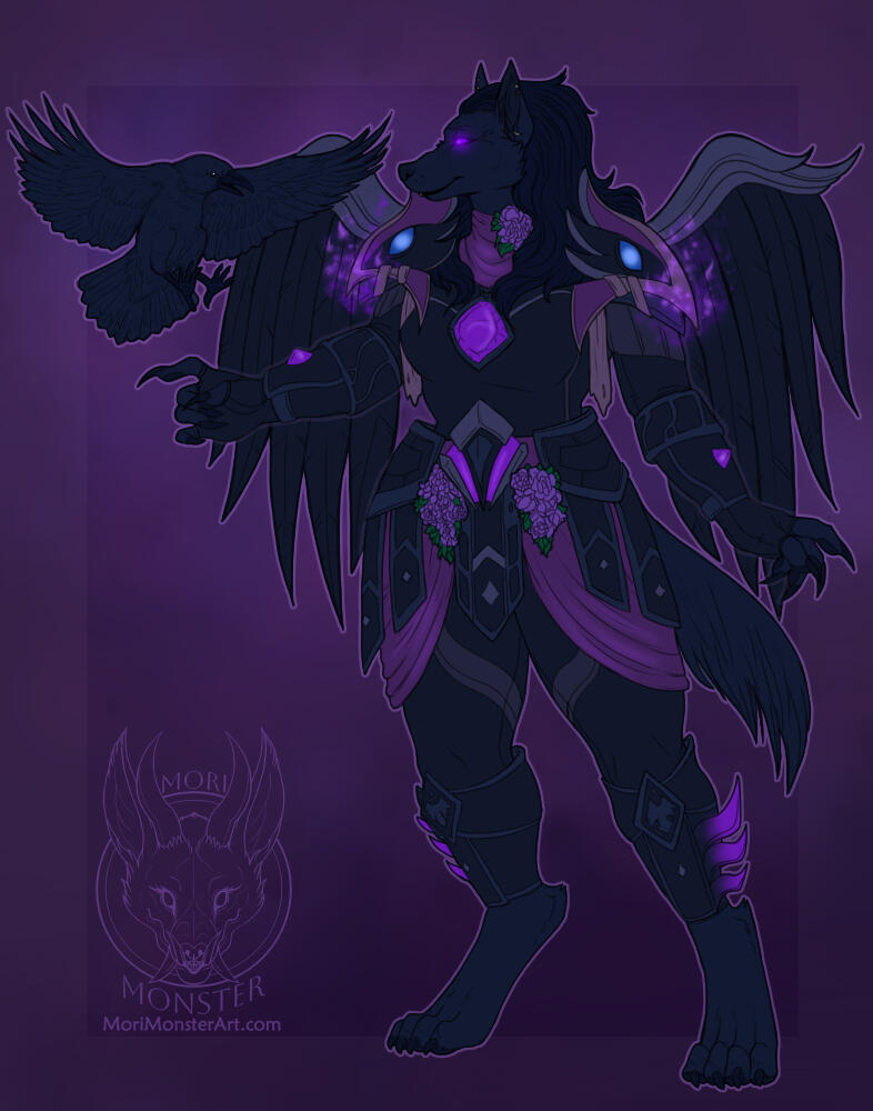 History:Notes: Sassy idiot. She has a tail. Full raven affinity.Aesthetics: Purple, black-blue, ravens, birds in general, flowers, wings, silks.