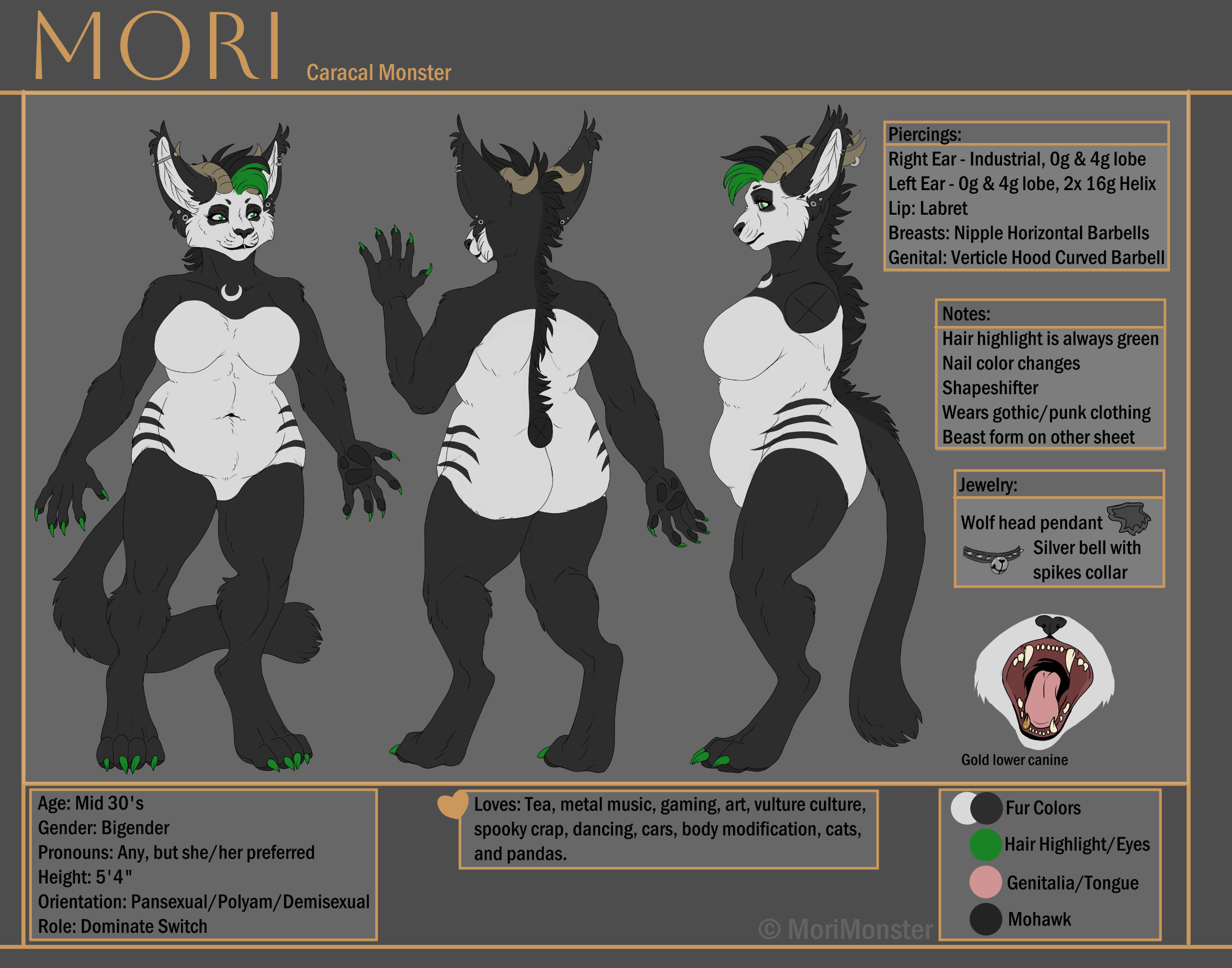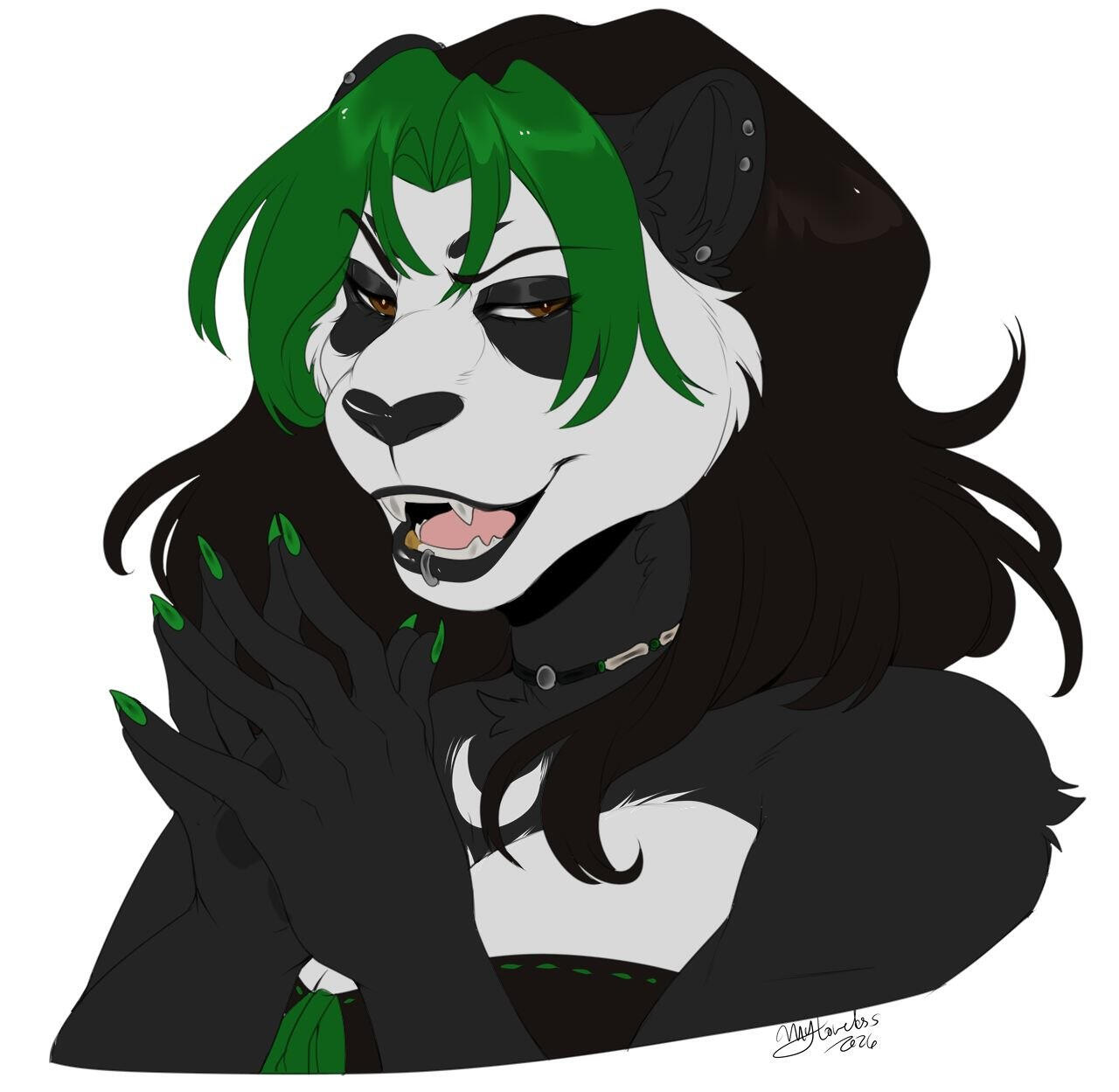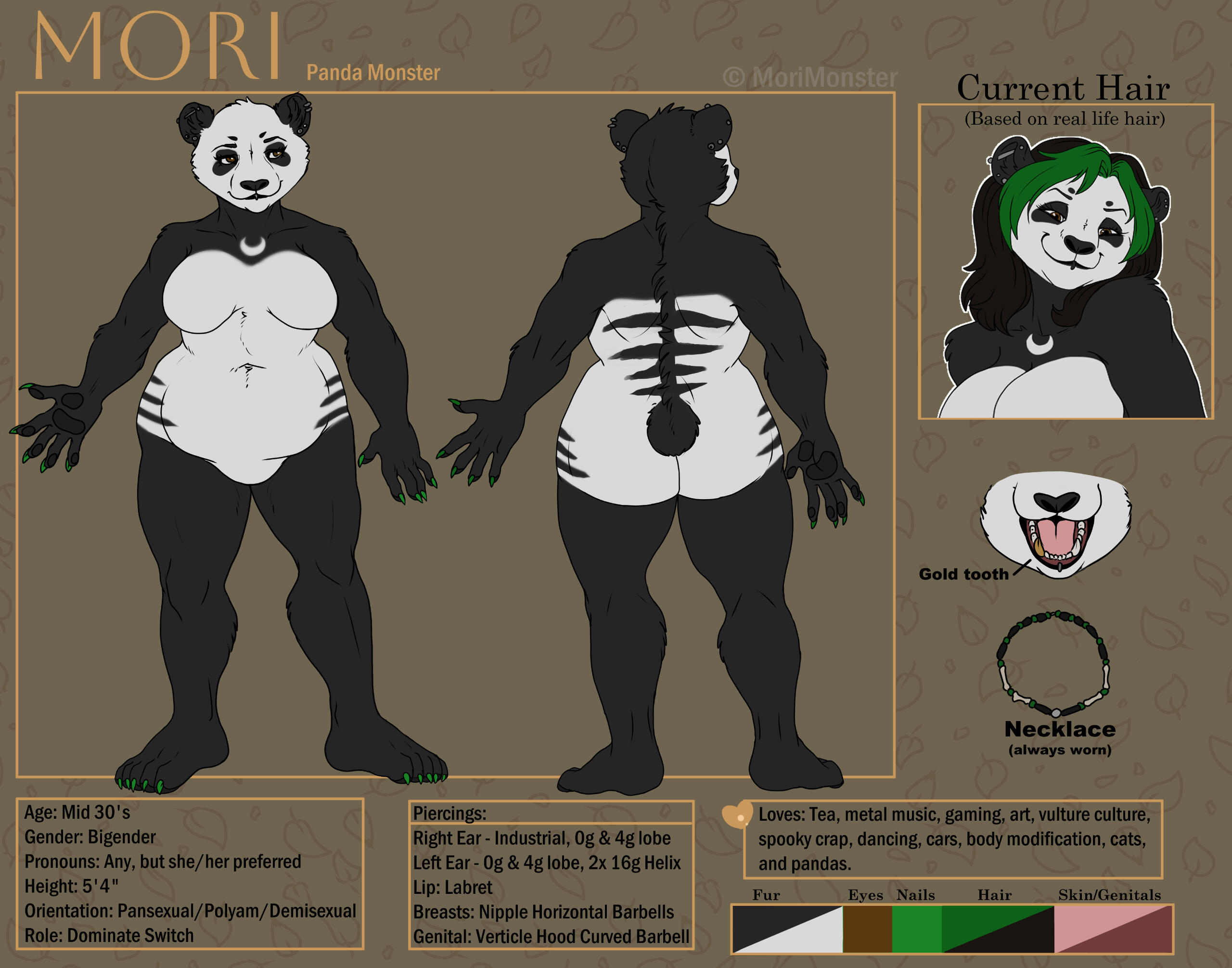 (Nesting partner, partner, and long-distance partner)Role: Dominate SwitchOccupation: ArtistCardinal Direction: EastElement: Water/EarthAspect: Life and Death. Mori is a reflection of the self and the exploration that comes with it. Through the use of withcraft and shadow work, Mori is the process of looking at the good and bad traits we all have and share and striving to learn, do better, and forgive.Appearance: Mori is a giant panda with black markings that cover her arms and legs, with a curved arch over her bust and a upwards crescent moon on her chest. Three stripes are on either side of her hip. A black trail follows down her spine and to her tail, which is also black. From the trail there are wayward striping that gives her a slight rib-cage look on the back. Her face is white with a black nose, and black eye mask isolated to around each eye. There are two black dots above her brows. Her bangs are always bright green, with the rest a very dark brown. Her hair is shoulder length, with a slight wave to it. Her eyes are brown. She has a loop piercing in the center of her lower lip, along with two lobe piercings in each ear. Her right ear has an industrial piercing. There are two helix piercings in her upper left ear. Her claws and toe nails are usually painted bright green. She is full figured and chubby, with wide hips and a DD cup chest. She is not perky and perfect, her body shows weight and age.Personality: Playful and silly, but very caring and protective. Has been noted of having a strong presence and quick-witted humor, but is very friendly and pretty chill. Been compared to Toph (ATLA), Haruko (FLCL), Vegeta (DBZ), Jane (Daria), and Sailor Venus (Sailor Moon).Likes: Art, tea, collecting bones (vulture culture), cars, video games, cats, bees, metal music, role-playing, dancing.Dislikes: Olives, baby corn.Favorite food: Crab legs, Mongolian BBQ.