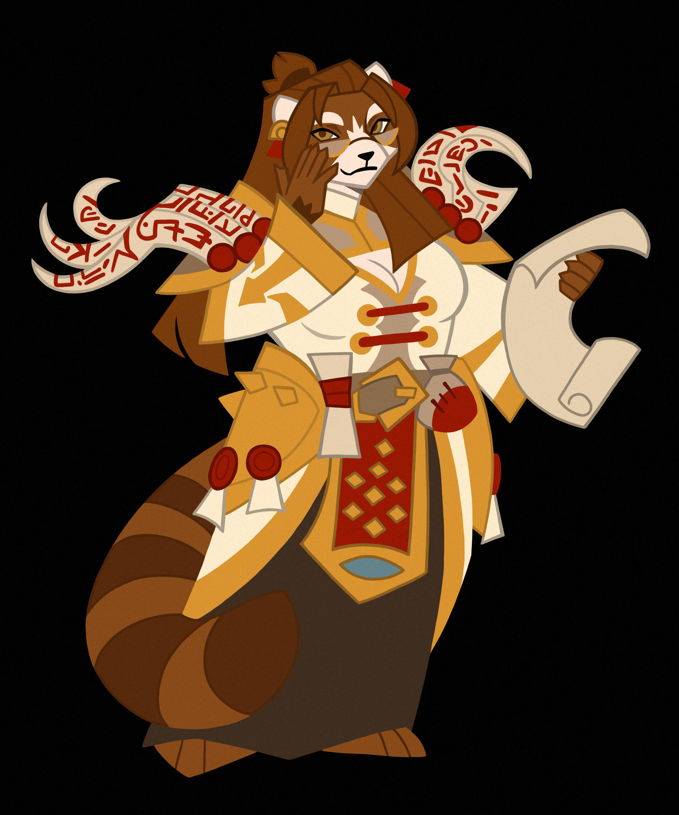 Name: Kyochi GottschalkMaiden Name: SunscrollAge: Late 40'sHeight: 6'4"Sex: FemalePronouns: She/HerSpecies: Mainland PandarenOrientation: StraightRole: Submissive BottomMarital Status: MarriedOccupation: Celestial Priestess, Lorewalker. Deputy Minister of the Gilneas Ministry of Health. Deaconess of the Gilneas Diocese.Appearance: Covered head to toe in white and gold attire, Kyo gives an air of regality and presumptuousness, though that couldn't be further from the truth. A maturely aged Pandaren, Kyo is as kind as she is red, which is to say.. a lot. Sporting more of the red-pandaren variant of fur, she stands well over 6ft and with a full figured form and a dark-striped tail behind her. It's quite obvious she is not a front-line fighter or the combat type, a pair of half-lensed glasses resting on her nose and usually seen carrying a lantern-topped staff that seems more as a symbolic and practical accessory than an actual weapon. Her hair matches her fur, a reddish-brown and lacking in any of the bright colored highlights that her kin often have. Her eyes are a golden honey brown, framed by a reddish mask of color against her otherwise white fur. Her appearance is always neat and tidy, if not overly feminine.Personality: Hailing from the Jade Forest on the mainlands of Pandaria, this pandaren has a penchant for history and healing of all sorts. Years of study and practice, whether within traditional means of scalpel and stitches, to a more magical approach with Chi, a blessing from her patron celestial, she has served as an avid scholar and healer from the Temple of the Jade Serpent. It's obvious this bear has a bit of experience under her belt, though remains ever eager to learn and study something new. Her studies and penchant for research is quite obvious, the woman often seen with books, tomes, notes, and an assortment of papers that contain lists, notes, tidbits of history, and anything else she deems worthy of note. Which, unfortunately, is a lot. A core belief that history must be preserved and that experience and stories of others can teach many lessons, she is a chronicler at heart, and may or may not note any information you may give her.As to be expected for her profession, Kyo is a huge nerd. Books, tomes, scrolls, pamphlets, notes and schematics; none of it is ever enough. With extensive research and practice going into her craft, she is always looking to learn more and keep up to date with her medical and healing knowledge, as well as documenting every step of the way. This curiosity also extends to flora, with the goal of learning of various herbs and plants and what properties are best for different ailments.Likes: Research, books, reading, documenting, organizing, studying, healing, alchemy, flora.Dislikes: Selfishness.Favorite food: Crab.