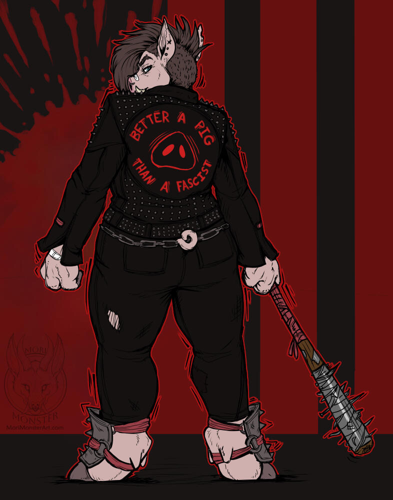 Name: BridgetteAge: Early 20'sHeight: 5'10"Sex: FemalePronouns: AnySpecies: Norwegian Yorkshire PigOrientation: PansexualRole: SwitchOccupation: Line ChefCardinal Direction: DownElement: WoodAppearance: A chubby pink-skinned pig, with a messy dark brown mohawk that is shaved everywhere else. Her eyes are a teal-blue with thick brown brows. She has small tusks and her ears are tattered. She has an eyebrow piercing in her left brow and two nostril piercings. She is covered in a variety of tattoos and her toes and finger tips are dark brown and more pig-like. She only has three fingers.Personality: She has no time for any kind of BS and will make that clear. If you're being an a-hole, she'll gladly tell you, but is extremely protective and passionate for those she cares about. She is definitively one that you want in your corner. She lives by her personal motto: 'Do no harm, but take no shit.'Likes: Heavy music, hole-in-the-wall food places that always have the best stuff, tattoos, piercings, body modification.Dislikes: Entitled people.