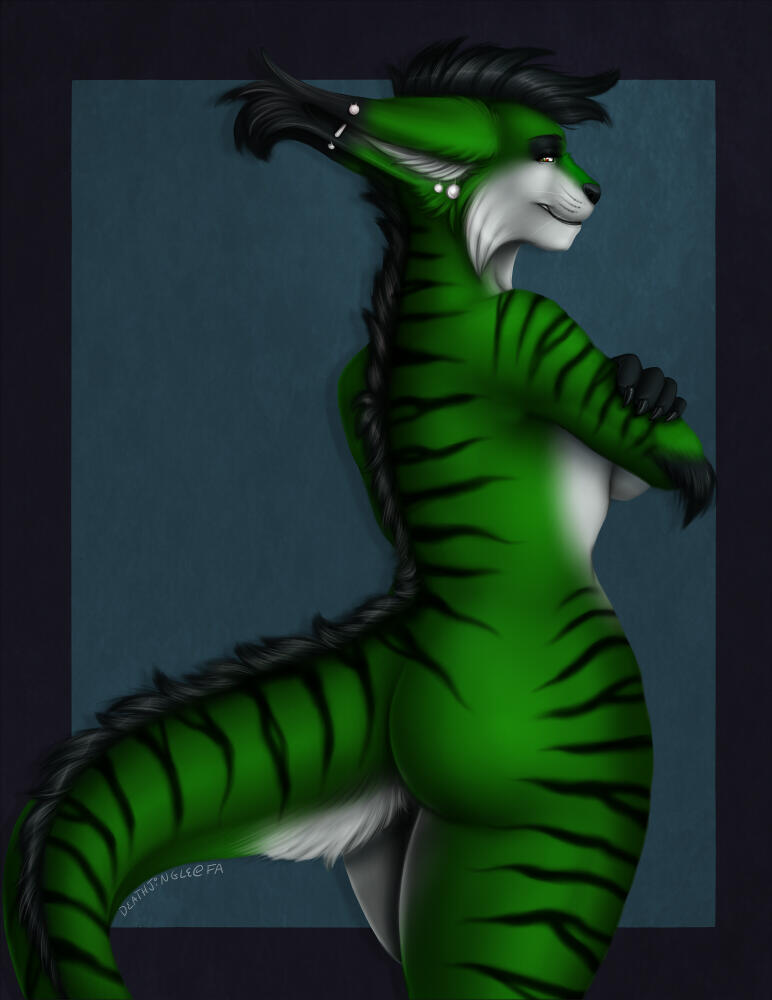 Name: TekAge: Late 20'sHeight: 5'6"Sex: FemalePronouns: She/HerSpecies: Caracal MonsterOrientation: BisexualRole: Dominate Switch BottomOccupation: Professional DancerCardinal Direction: NortheastElement: LightAspect: Joy and self expression. Tek is the icon of expression, learning to take joy in what you do, whether it be art, music, song, dance, or any other expression. Tek, with her bright green coloration and odd tail, is unusual when it comes to standard caracal colors and shape but still finds happiness in her self and encourages others to do the same.Appearance: A bright green and black caracal with large ears and lengthy cheek tuffs. Her eyes are red with yellow around the iris. Her forearms and calves are black, with black striping fading up her limbs. A fluffy trail of black fur goes down her spine and into a large, lizard-like prehensile tail, as well as up the back of her neck and to her head into a large messy mohawk.Personality: Fun-loving and free spirited, she enjoys making dumb jokes and getting people to laugh. She enjoys a good night out dancing and always goes to bed at 3am or later.Likes: EDM, techno, late-night car drives, 24 hour food places, sleeping in, weed.Dislikes: Bad food, waking up early.