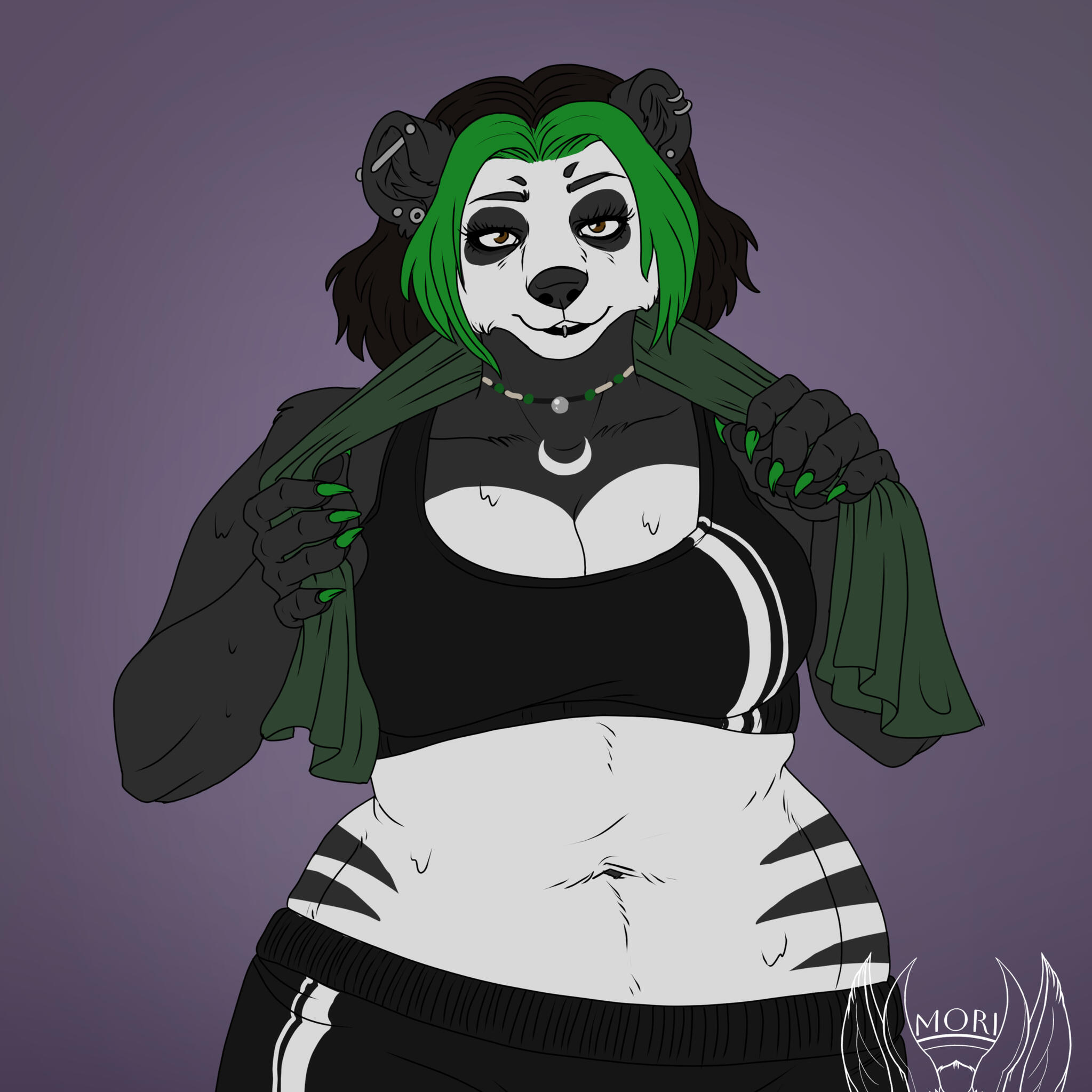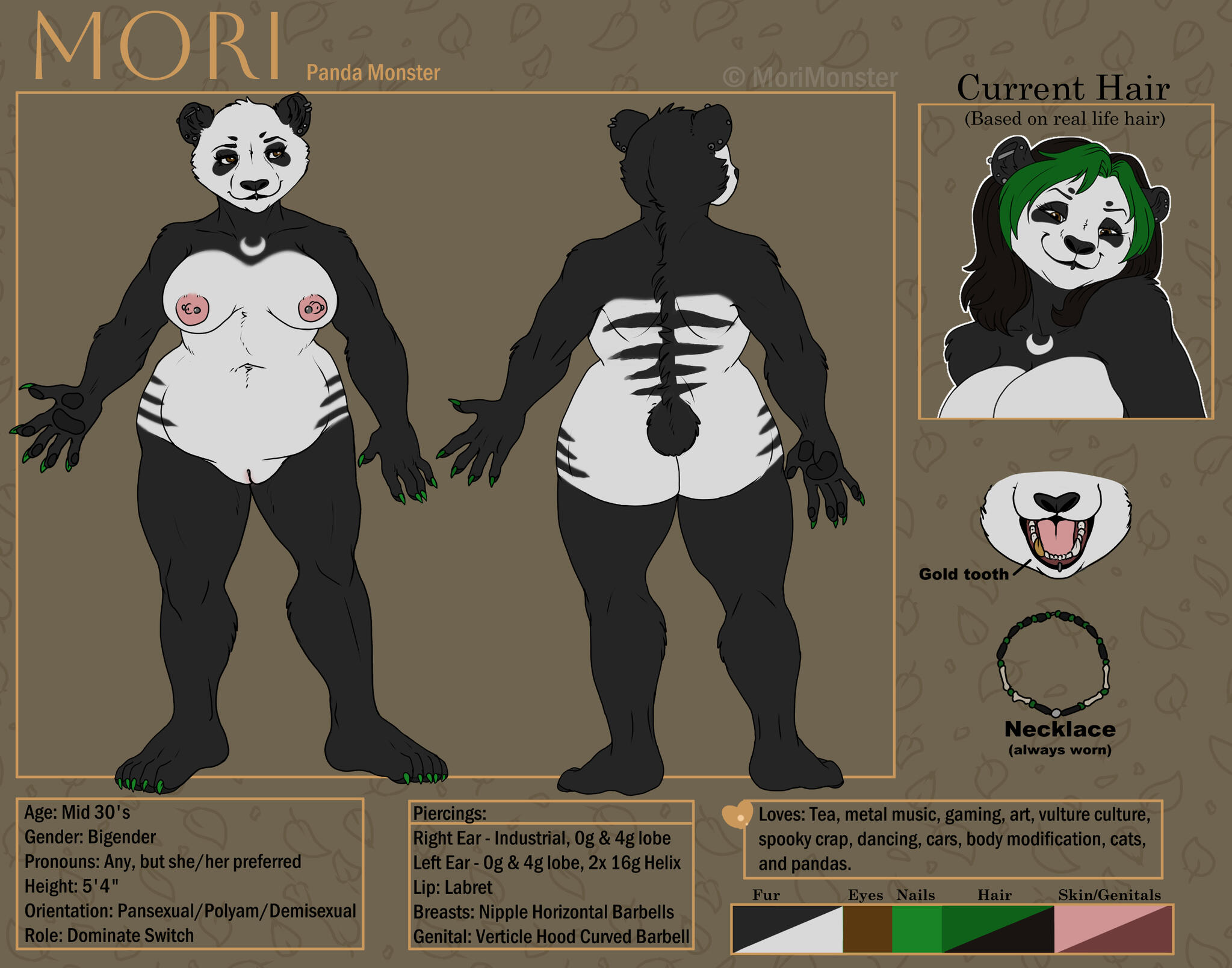 (Nesting partner, partner, and long-distance partner)Role: Dominate SwitchOccupation: ArtistCardinal Direction: EastElement: Water/EarthAspect: Life and Death. Mori is a reflection of the self and the exploration that comes with it. Through the use of withcraft and shadow work, Mori is the process of looking at the good and bad traits we all have and share and striving to learn, do better, and forgive.Appearance: Mori is a giant panda with black markings that cover her arms and legs, with a curved arch over her bust and a upwards crescent moon on her chest. Three stripes are on either side of her hip. A black trail follows down her spine and to her tail, which is also black. From the trail there are wayward striping that gives her a slight rib-cage look on the back. Her face is white with a black nose, and black eye mask isolated to around each eye. There are two black dots above her brows. Her bangs are always bright green, with the rest a very dark brown. Her hair is shoulder length, with a slight wave to it. Her eyes are brown. She has a loop piercing in the center of her lower lip, along with two lobe piercings in each ear. Her right ear has an industrial piercing. There are two helix piercings in her upper left ear. Her claws and toe nails are usually painted bright green. She is full figured and chubby, with wide hips and a DD cup chest. She is not perky and perfect, her body shows weight and age.Personality: Playful and silly, but very caring and protective. Has been noted of having a strong presence and quick-witted humor, but is very friendly and pretty chill. Been compared to Toph (ATLA), Haruko (FLCL), Vegeta (DBZ), Jane (Daria), and Sailor Venus (Sailor Moon).Likes: Art, tea, collecting bones (vulture culture), cars, video games, cats, bees, metal music, role-playing, dancing.Dislikes: Olives, baby corn.Favorite food: Crab legs, Mongolian BBQ.