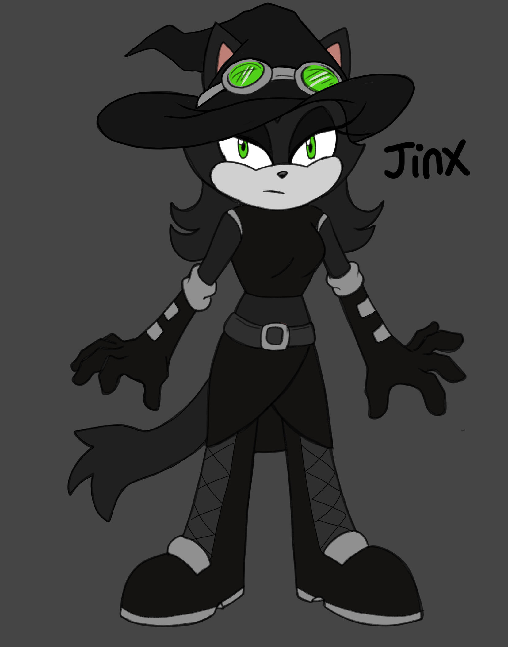 Name: JinxAge: UnknownHeight: 2'10"Sex: FemalePronouns: She/HerSpecies: Cat Mobian (Sonic Universe)Orientation: DemisexualRole: SwitchMarital Status: SingleOccupation: Tech-WitchAppearance: Black cat with green eyes and white muzzle. Flesh is pink. Always seen in black/dark attire and a witch hat.Personality: Strong-headed, stubborn, intelligent.Likes: Tech, magic, flickys. Stealing Dr. Robotniks tech to reverse-engineer it and use it for herself.Dislikes: Dr. Robotnik, other people telling her how to do things, people getting in her way.Favorite food: Corndogs.